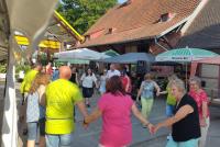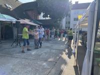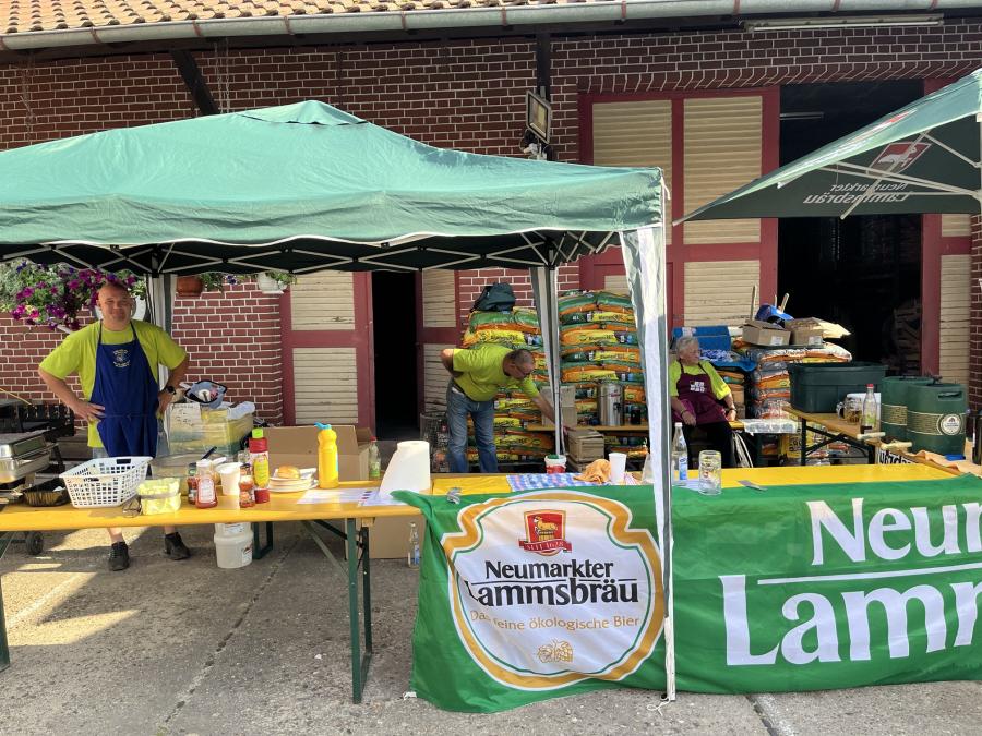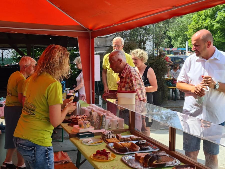 Alles war aufgebaut, Kaffee, Kuchen, Steaks und Bratwörschd warteten nur darauf an den Mann / an die Frau gebracht zu werden. Blieb noch die Frage zu beantworten, ob die Bürgerinnen und Bürger bei den hohen Temperaturen wirklich kommen würden. Und es sollte prallvoll werden. Ab 13:30 Uhr strömten die Gäste auf das Gelände und füllten schnell die Plätze im Zelt und unter den Schirmen. Innerhalb kürzester Zeit mussten weitere Schirme und Bänke aufgestellt werden. Immer weiter und immer weiter und am Ende gab es nur noch Plätze in der Sonne. Das war für den Verein sehr erfreulich anzusehen. Mit so einem Zulauf hatte man bei den hohen Temperaturen gar nicht gerechnet. Einfach toll.